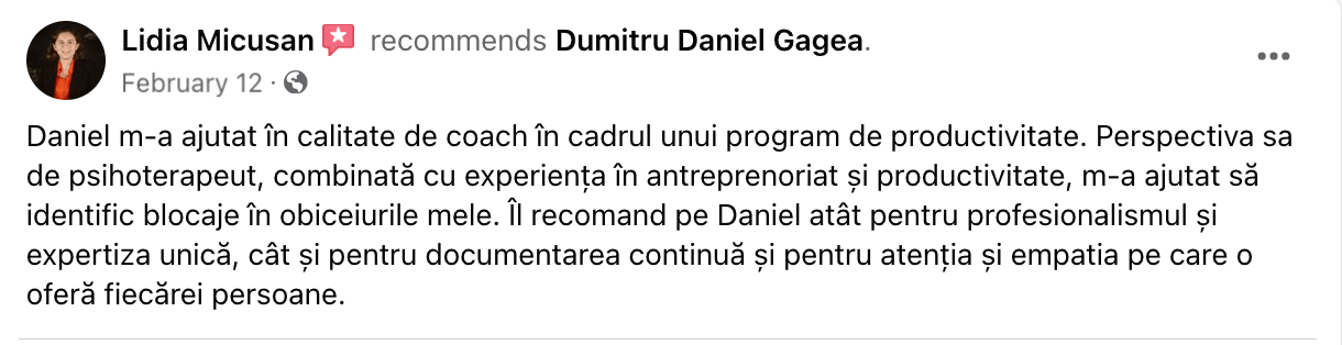 Sunt specializat în productivitate, evaluarea și predicția comportamentului uman, în Evaluarea si Interventia in Trauma și în consilierea cuplurilor